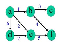 Vous noterez que rien n'interdit la présence dans le graphe de l'arc (e,f) et (f,e). d est un sommet isolé : il n'est relié à aucun autre a et b sont adjacents l'arc 4 est incident à f b et e sont des prédécesseurs de f b et e sont des successeurs de a le demi-degré extérieur de e = 1 le demi-degré intérieur de e = 2 le degré de e = 3